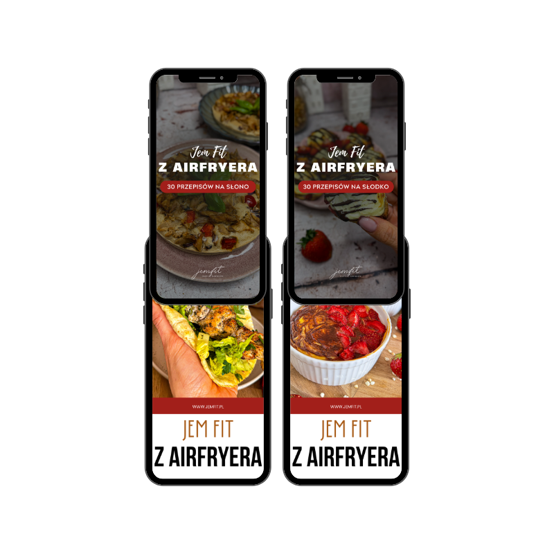 - ▪️ 4 e-booki w formie PDF – „JemFit z Airfryera część 1: na słodko i na słono” oraz „JemFit z Airfryera – część 2: na słodko i na słono”.